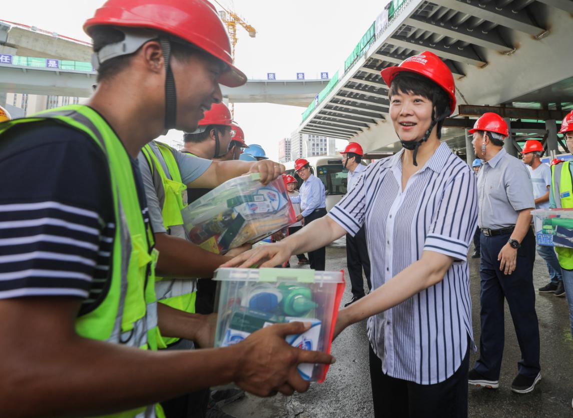 張寶娟一行實(shí)地察看了國(guó)泰創(chuàng)新中心、潤(rùn)揚(yáng)快速路、長(zhǎng)江水務(wù)和揚(yáng)州古城保護(hù)成果展示館,詳細(xì)了解項(xiàng)目建設(shè)情況。在潤(rùn)揚(yáng)路快速化改造工程江陽(yáng)路互通立交施工現(xiàn)場(chǎng),張寶娟給一線的工人們送上防暑物品。她囑咐企業(yè)負(fù)責(zé)人,高溫下連續(xù)工作非常辛苦,要確保高溫天氣作業(yè)安全和工程質(zhì)量,科學(xué)合理安排工時(shí),做好防暑降溫工作,確保如期完成工程建設(shè),早日惠及揚(yáng)州人民。