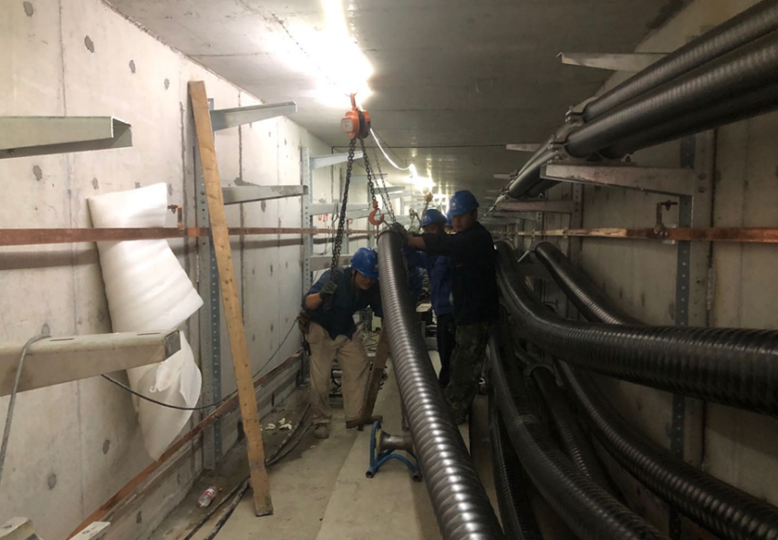 因高壓線不能滿足萬??焖俾方ㄔO(shè)的安全距離,萬??焖俾?/span>220KV電力管廊工程于今年5月1日進(jìn)場(chǎng)施工,整個(gè)電力線路遷改工程包括新建地下電纜隧道、電纜溝總計(jì)約1676米,需對(duì)3條次110千伏電力線路和4條次220千伏電力線路實(shí)施遷改,將原先萬??焖俾贩秶鷥?nèi)架空線路全部下地安裝在電纜隧道內(nèi),施工難度大、技藝要求高,是揚(yáng)州首次開展如此規(guī)模的電纜下地工作。目前電纜隧道主體工程已經(jīng)完工,正在進(jìn)行電纜下地施工。