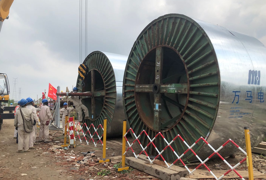 隨著快速路工程的穩(wěn)步推進(jìn),電力管線遷改工作也在同步進(jìn)行?!耙欢⒓芷饋?!”9月11日下午,在萬??焖俾?/span>220KV電力管廊工程電纜隧道內(nèi),一根長(zhǎng)約450米,重約20噸的電纜線盤被電力工人用機(jī)械抬到了托臂上。