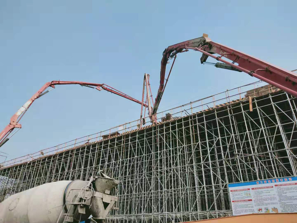 此次澆筑的箱梁底腹板為潤揚路快速化改造工程中長度最長、工程量最大的段面,共三跨、125米,共計澆筑1800m3。第六聯(lián)現(xiàn)澆箱梁上跨楊柳青路,跨徑為35米、55米、35米,采用門洞支架施工,確保楊柳青路正常通行。門洞采用兩跨的形式,凈高5米,單跨寬7.5米,能夠保證車輛正常通行。項目主線高架橋橋梁全長1129.63米,共13聯(lián),其中12聯(lián)為預(yù)應(yīng)力混凝土連續(xù)箱梁,1聯(lián)為鋼箱梁。
