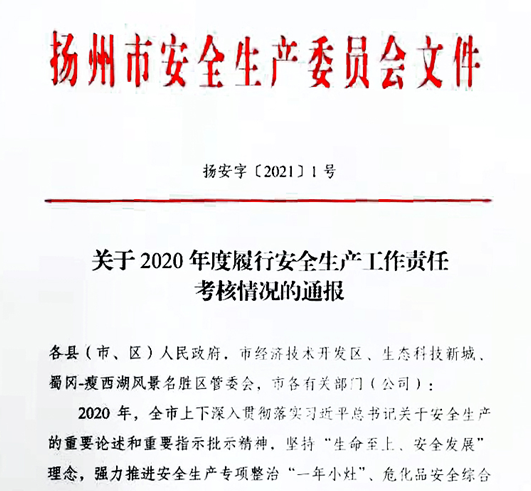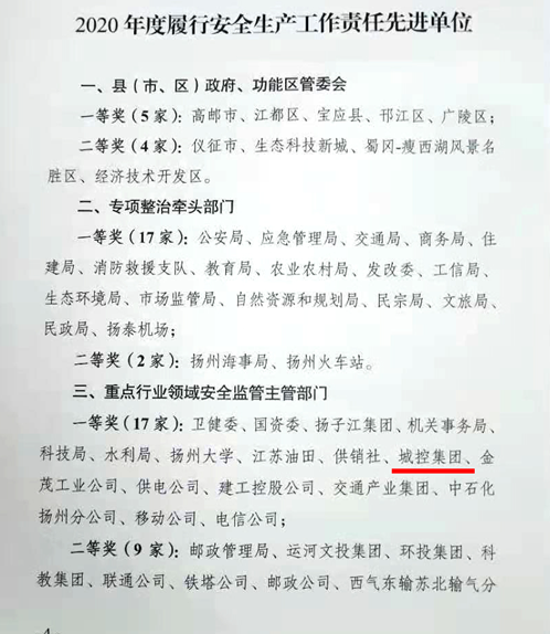 2020年,城控集團深入貫徹落實習(xí)近平總書記關(guān)于安全生產(chǎn)重要論述,堅持“生命至上、安全發(fā)展”理念,強力推進安全生產(chǎn)專項整治,創(chuàng)新工作舉措,順利完成市安委會下達的目標任務(wù),為揚州市全年事故起數(shù)和死亡人數(shù)大幅“雙下降”貢獻城控力量,被市安委會表彰為2020年度履行安全生產(chǎn)工作責任先進單位一等獎。
