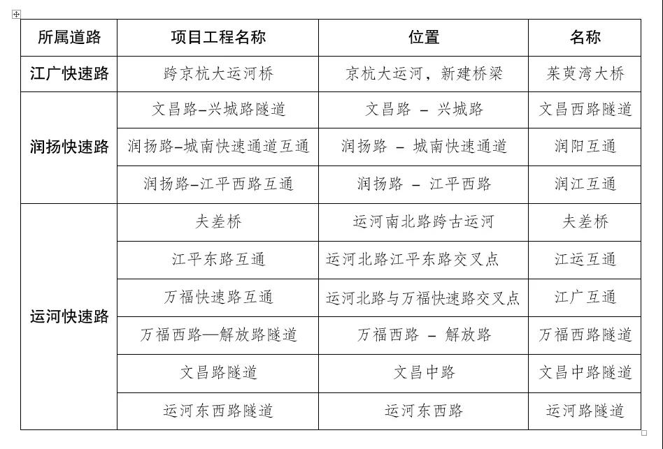 運(yùn)河快速路:位于邗江區(qū)及廣陵區(qū),運(yùn)河北路、運(yùn)河南路原址改造,北起江平東路,南至七里河路。全長(zhǎng)約7.85公里,包括4.75公里高架、2.5公里隧道、0.6公里地面段和2座互通。