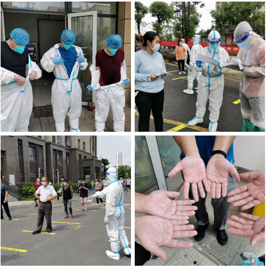 “幫我對照下防護服穿戴教學視頻,順序對不對?全部保護了沒有?”這是志愿者首次穿戴全套防護用具時忐忑的話語。初次接觸防護服,雖然前期教學培訓過,但內(nèi)心期待中還有些許緊張,動作生疏卻很仔細,大家相互幫忙、相互學習、相互監(jiān)督,確保不留任何漏洞,檢測過程中,大家要做好測量體溫、核對人員信息、核查健康碼、提醒保持安全距離、幫助老弱病殘及特殊人群等工作,有時還要應對暈厥的居民、易怒的群眾情緒以及少部分特殊群體的交流障礙,一次核酸檢測的時間大概在3小時左右,這樣高強度的工作環(huán)境,大家沒有任何怨言,除去防護服的那一刻,看著臉上深深的勒痕、滴水的上衣和發(fā)白的雙手,有的只是相視一笑,再次投身到小區(qū)封控管理工作中去。