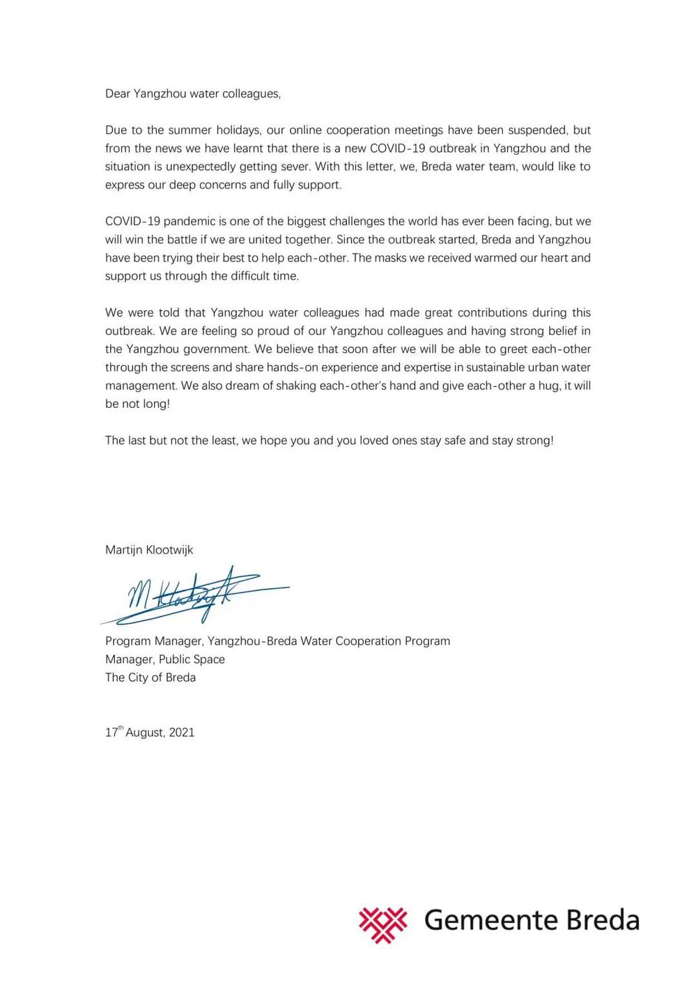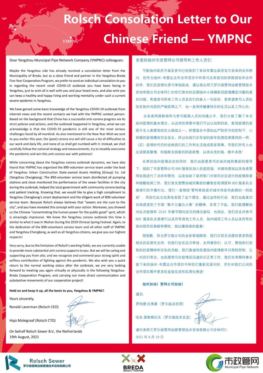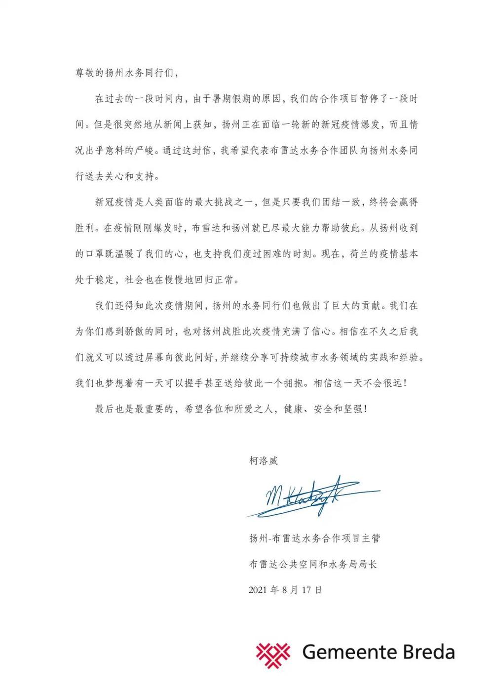 8月18日,在我市新冠肺炎疫情防控的攻堅時刻,城控集團收到荷蘭布雷達市公共空間和水務局以及羅爾施管網(wǎng)運維管理技術(shù)咨詢有限公司發(fā)來的暖心慰問函。信函中,布雷達市公共空間和水務局局長馬丁·科洛威先生以及羅爾施管網(wǎng)運維管理技術(shù)咨詢有限公司總經(jīng)理羅納德·拉弗曼先生對我市正在蔓延的新冠肺炎疫情表示關(guān)切;向身處疫情中的廣大城控集團員工及家人表示誠摯的問候,對“890管網(wǎng)服務隊”代表的“城控”抗疫志愿者奮戰(zhàn)“疫”線的擔當精神,致以崇高的敬意。這封遠隔重洋飛馳而來的慰問信,彰顯了兩座城市間彌足珍貴的友誼,也增強了“城控人”打贏這場疫情防控阻擊戰(zhàn)的信心。