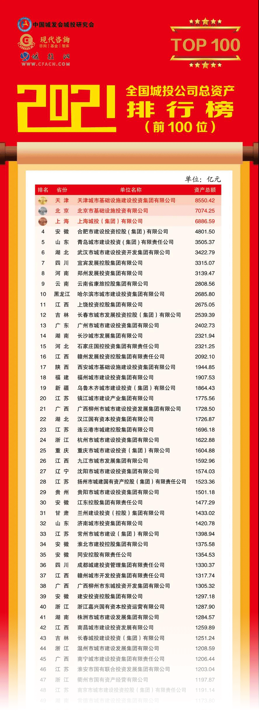 該排行榜由中國(guó)城市發(fā)展研究會(huì)城市建設(shè)投融資研究專業(yè)委員會(huì)(簡(jiǎn)稱”中國(guó)城發(fā)會(huì)城投研究會(huì)”)、江蘇現(xiàn)代資產(chǎn)投資管理顧問(wèn)有限公司(簡(jiǎn)稱“現(xiàn)代咨詢”)和城投網(wǎng)聯(lián)合發(fā)布,迄今已連續(xù)發(fā)布8年,主要反映全國(guó)城投公司規(guī)模變化的總資產(chǎn)排名情況,目前已成為全國(guó)城投行業(yè)群體發(fā)展?fàn)顩r和城投轉(zhuǎn)型升級(jí)的權(quán)威發(fā)布。