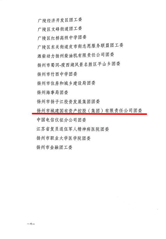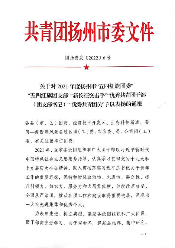 2022年是中國共青團(tuán)成立100周年。近日,揚(yáng)州團(tuán)市委印發(fā)了《關(guān)于對2021年度揚(yáng)州市“五四紅旗團(tuán)委”“五四紅旗團(tuán)支部”“新長征突擊手”“優(yōu)秀共青團(tuán)干部(團(tuán)支部書記)”“優(yōu)秀共青團(tuán)員”予以表揚(yáng)的通報(bào)》(揚(yáng)團(tuán)委發(fā)〔2022〕6號),城控集團(tuán)團(tuán)委被授予2021年度揚(yáng)州市“五四紅旗團(tuán)委”稱號。