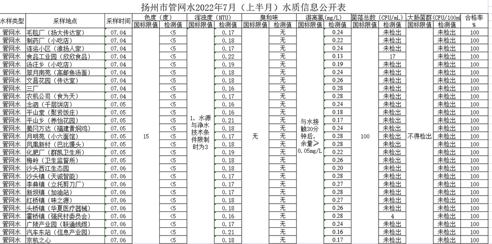 揚(yáng)州市管網(wǎng)水2022年7月(上半月)水質(zhì)信息公開(kāi)表