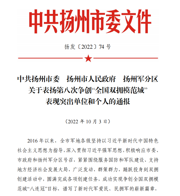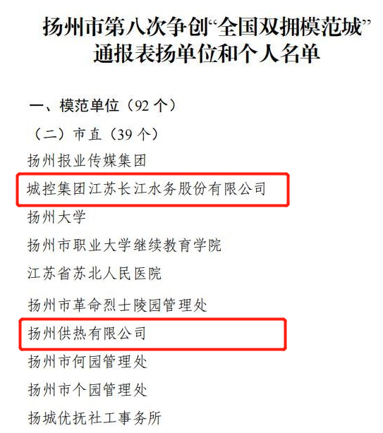 近日,揚(yáng)州市市委、市政府、軍分區(qū)印發(fā)《關(guān)于表揚(yáng)第八次爭創(chuàng)“全國雙擁模范城”表現(xiàn)突出單位和個人的通報》,城控集團(tuán)所屬江蘇長江水務(wù)股份有限公司、揚(yáng)州供熱有限公司兩家單位榮獲爭創(chuàng)“全國雙擁模范城”表現(xiàn)突出單位。