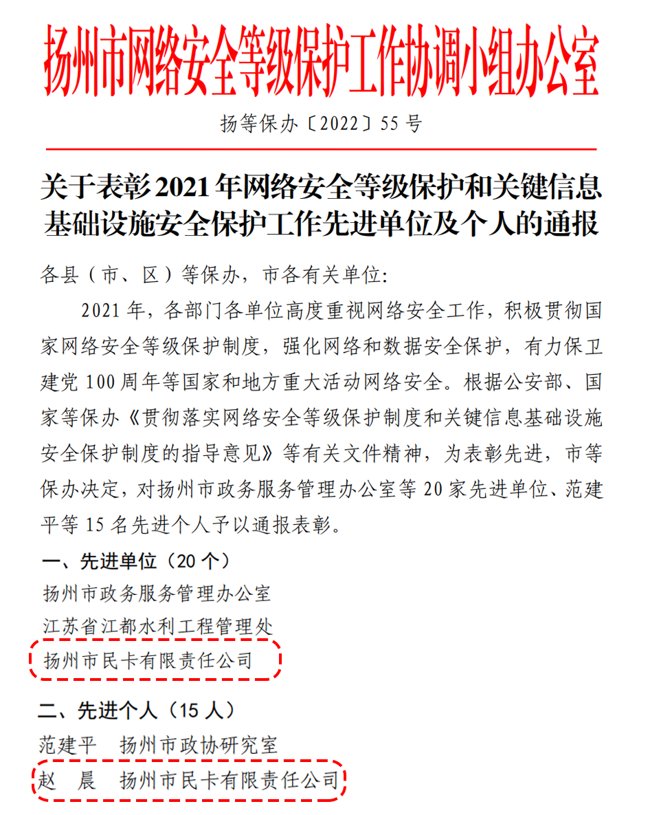 近日,揚(yáng)州市民卡公司被揚(yáng)州市網(wǎng)絡(luò)安全等級(jí)保護(hù)工作協(xié)調(diào)小組辦公室評(píng)為“2021年網(wǎng)絡(luò)安全等級(jí)保護(hù)和關(guān)鍵信息基礎(chǔ)設(shè)施安全保護(hù)工作先進(jìn)單位”,趙晨同志被表彰為“先進(jìn)個(gè)人”。