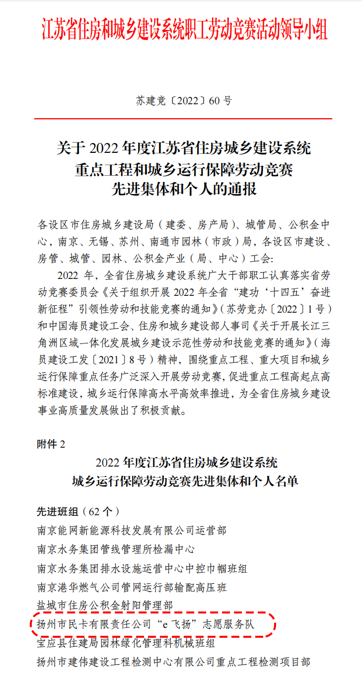 近日,江蘇省住房和城鄉(xiāng)建設(shè)系統(tǒng)職工勞動(dòng)競(jìng)賽活動(dòng)領(lǐng)導(dǎo)小組發(fā)布《關(guān)于2022 年度江蘇省住房城鄉(xiāng)建設(shè)系統(tǒng)重點(diǎn)工程和城鄉(xiāng)運(yùn)行保障勞動(dòng)競(jìng)賽先進(jìn)集體和個(gè)人的通報(bào)》,市民卡公司“e 飛揚(yáng)”志愿服務(wù)隊(duì)被授予“2022 年度江蘇省住房城鄉(xiāng)建設(shè)系統(tǒng)城鄉(xiāng)運(yùn)行保障勞動(dòng)競(jìng)賽先進(jìn)班組”光榮稱號(hào)。