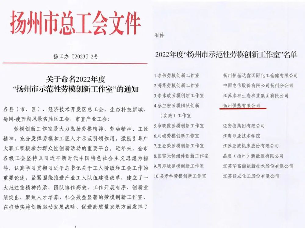 近日,供熱公司勞模團(tuán)隊(duì)創(chuàng)新(實(shí)踐)工作室被揚(yáng)州市總工會(huì)授予“揚(yáng)州市示范性勞模創(chuàng)新工作室”榮譽(yù)稱號(hào)。