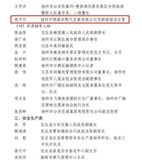 集團(tuán)所屬揚(yáng)州市政管網(wǎng)有限公司890管網(wǎng)服務(wù)隊(duì)獲評(píng)“巾幗模范集體”;集團(tuán)黨群部部長(zhǎng)、行業(yè)婦聯(lián)主席劉艷榮獲“巾幗榜樣”榮譽(yù)稱號(hào);集團(tuán)所屬揚(yáng)州中燃城市燃?xì)獍l(fā)展有限公司黨群部主管周平川榮獲“優(yōu)秀退役士兵”榮譽(yù)稱號(hào);集團(tuán)企管部副部長(zhǎng)李剛榮獲“安全生產(chǎn)類先進(jìn)個(gè)人”榮譽(yù)稱號(hào)。