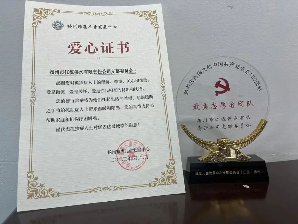 日前,長江水務(wù)江源公司“561”供水服務(wù)隊榮獲揚州市殘聯(lián)雛鷹兒童發(fā)展中心送來的愛心證書,感謝“561”供水服務(wù)隊的幫扶和服務(wù),并授予其“最美志愿團隊”稱號。