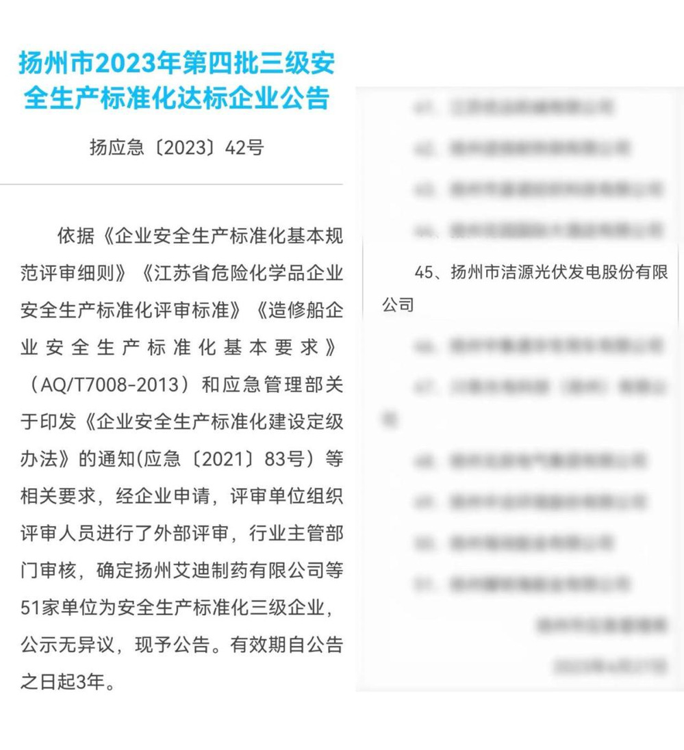 近日,揚州市應(yīng)急管理局發(fā)布公告,確定潔源光伏公司為“安全生產(chǎn)標(biāo)準(zhǔn)化三級企業(yè)”。