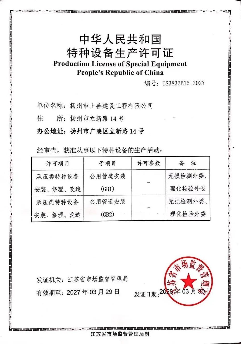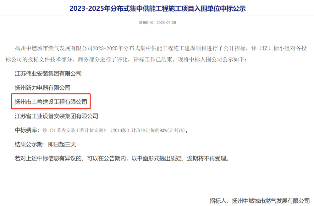 近日,上善公司成功取得特種設(shè)備生產(chǎn)許可證,并成功入圍揚(yáng)州中燃城市燃?xì)獍l(fā)展有限公司2023-2025年分布式集中供能工程施工庫。