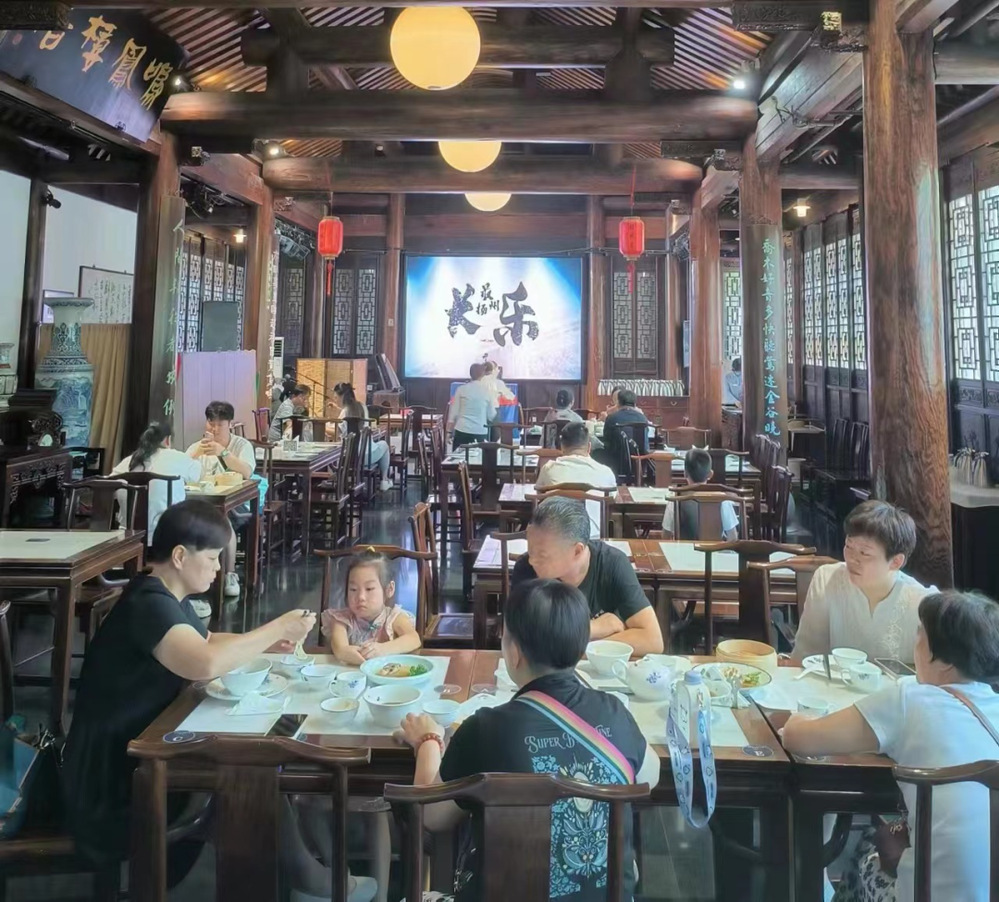 清晨,柔和的晨曦透過長樂客棧的軒窗,清幽與靜美在光影之間盡情流露。陣陣香氣在空氣中彌漫,一壺綠楊春,一盤燙干絲,現(xiàn)蒸的點心相繼擺上桌,一場早茶盛宴拉開帷幕。8月25日早晨,揚州新聞女生走進長樂客棧酒店,與大家共同打卡藏在古街里的淮揚園林早茶。