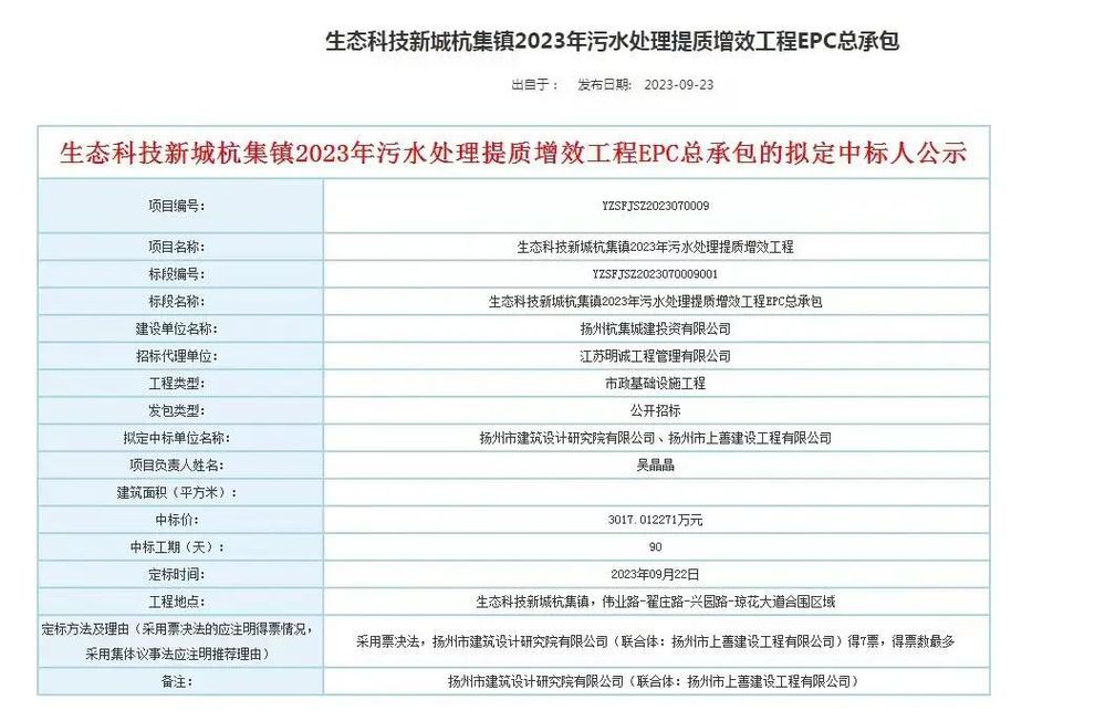 近期,上善公司再次成功中標生態(tài)科技新城杭集鎮(zhèn)污水處理提質增效工程,中標金額3017萬元。