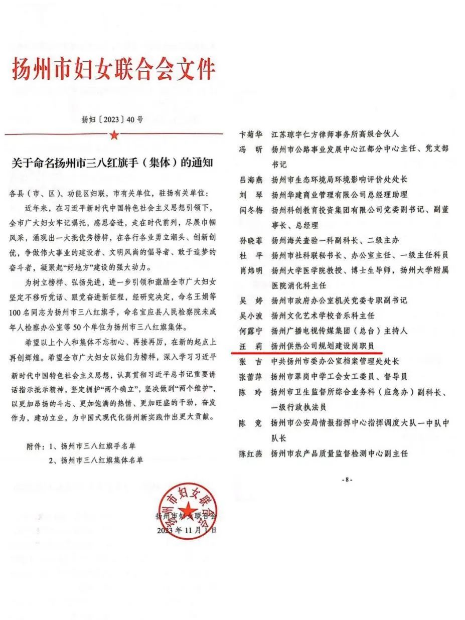 11月8日上午,揚(yáng)州市婦女第八次代表大會開幕,開幕會上表彰了揚(yáng)州市三八紅旗手(集體)。供熱公司總師辦職員汪莉獲得“揚(yáng)州市三八紅旗手”的榮譽(yù)稱號。