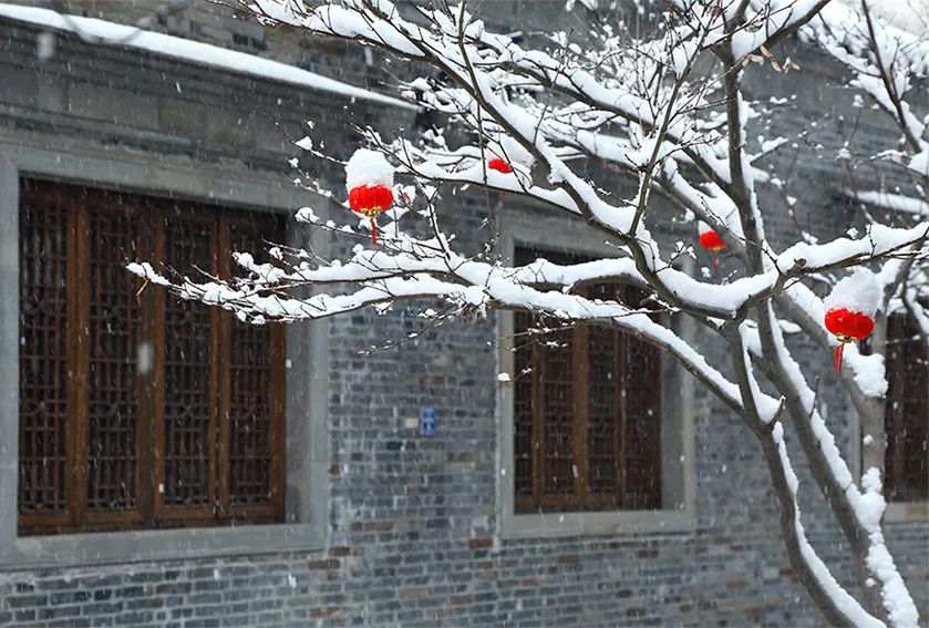 大雪賦予東關(guān)街吉祥,屋檐下的紅燈籠顯得格外耀眼。