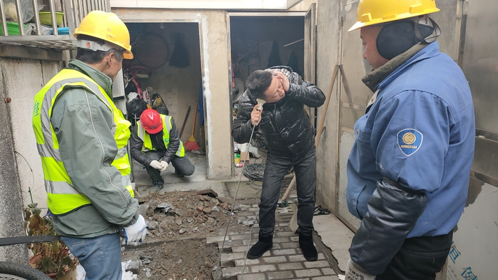 接到報修電話后,長江水務(wù)搶維修中心搶修人員立即趕到現(xiàn)場,細(xì)致查勘確定是表前PE63管道凍裂漏水造成水壓變小。嚴(yán)寒天氣下,地面凍得很硬,為方便搶修施工,搶維修中心又調(diào)來挖掘機(jī)開挖基坑,搶修人員冒著零度以下的嚴(yán)寒關(guān)閉閘門、停水搶修。在修復(fù)凍裂的管道后,供水搶修負(fù)責(zé)人到王大姐家打開水龍頭,檢查水壓是否正常,在獲得王大姐的滿意答復(fù)后才離開現(xiàn)場。在搶修尾聲,供水搶修人員又接到馬太巷居民報修處理的工單,搶修人員稍作休息又趕赴下一站。