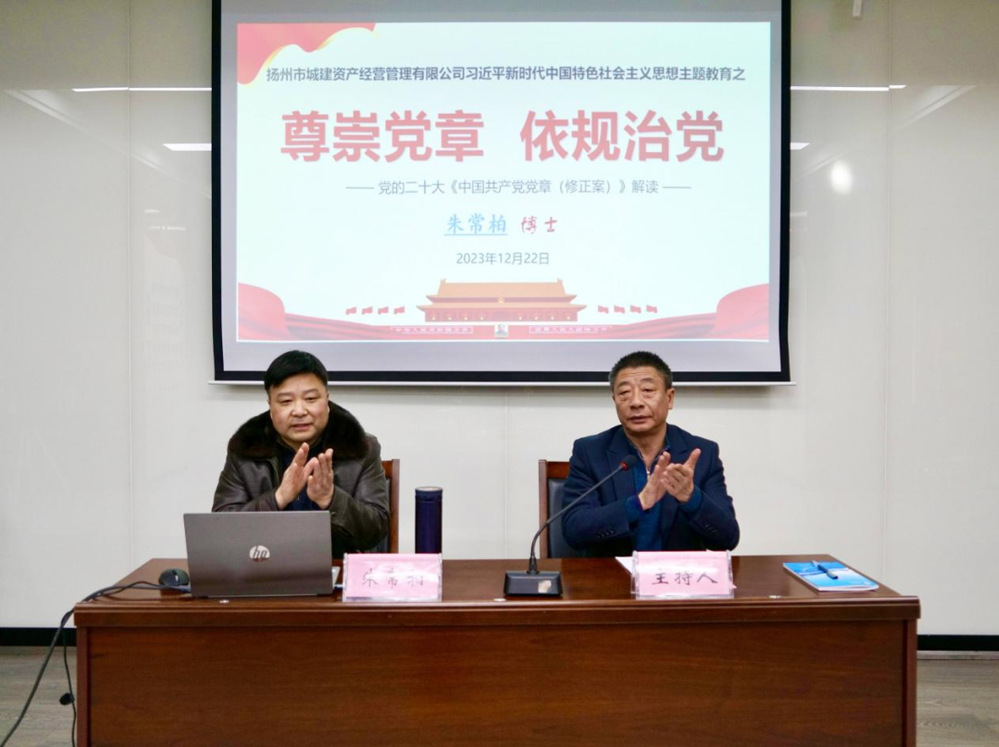 揚州大學(xué)法學(xué)博士、副教授、碩士生導(dǎo)師朱常柏博士以《尊崇黨章 依規(guī)治黨》為題,為大家進(jìn)行了學(xué)黨章專題輔導(dǎo),并根據(jù)新修訂的《中國共產(chǎn)黨章程》,對“黨章的地位與作用”“黨章的結(jié)構(gòu)與內(nèi)容”“黨章修正若干要點”三個方面作了重點解讀。朱博士講解風(fēng)格生動幽默,內(nèi)容結(jié)構(gòu)脈絡(luò)清晰,理論與實際相聯(lián)系、歷史與現(xiàn)實相對照,引導(dǎo)我們要時刻做到心中有黨、在黨言黨、對黨忠誠,進(jìn)一步增強尊崇黨章、遵守黨章、維護(hù)黨章的自覺性和堅定性,真正把黨章黨規(guī)內(nèi)化于心、外化于行。