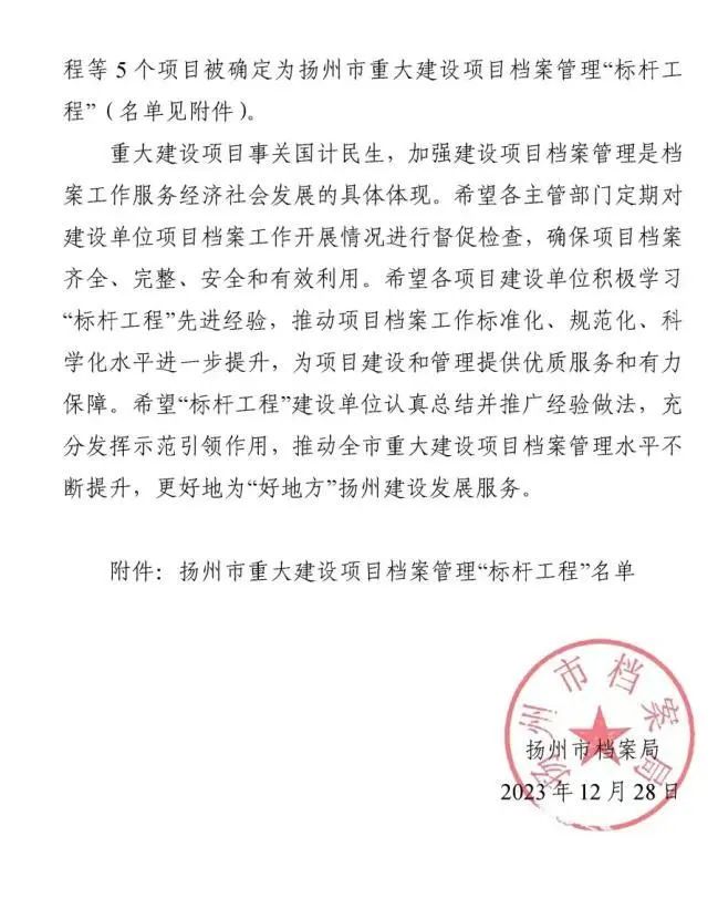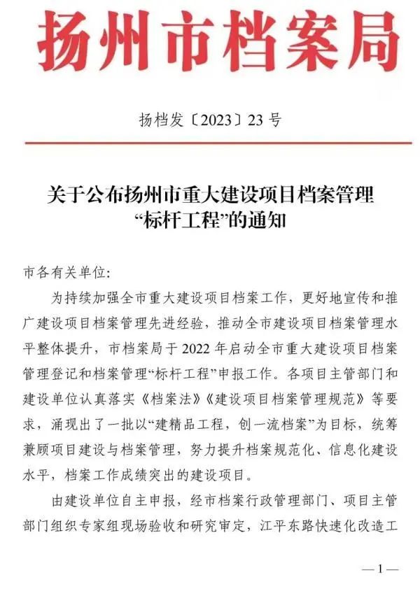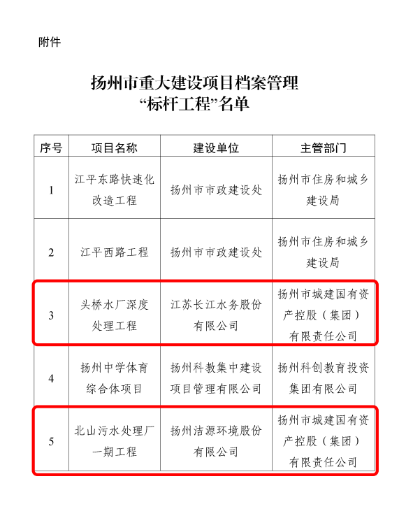近日,市城控集團頭橋水廠深度處理工程項目、北山污水處理廠一期工程榮獲揚州市檔案局頒布的揚州市重大建設項目檔案管理“標桿工程”榮譽稱號。