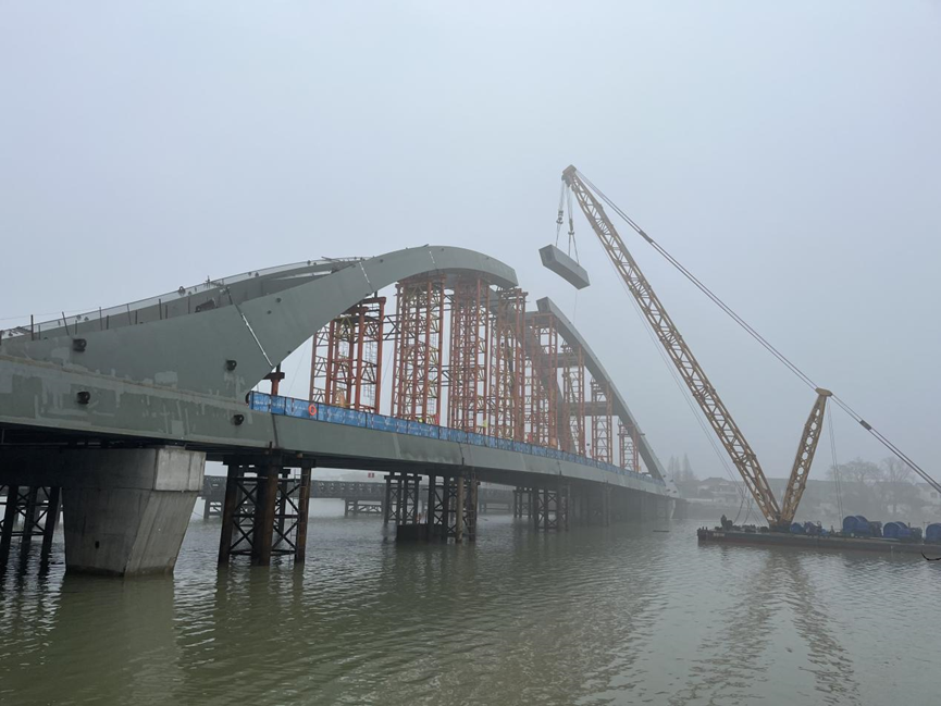 1月30日,隨著最后一段拱肋緩緩吊裝至合攏位置,歷時一年,壁虎河大橋鋼箱提籃拱橋主拱順利合攏,標(biāo)志著該項目取得了重要節(jié)點突破。