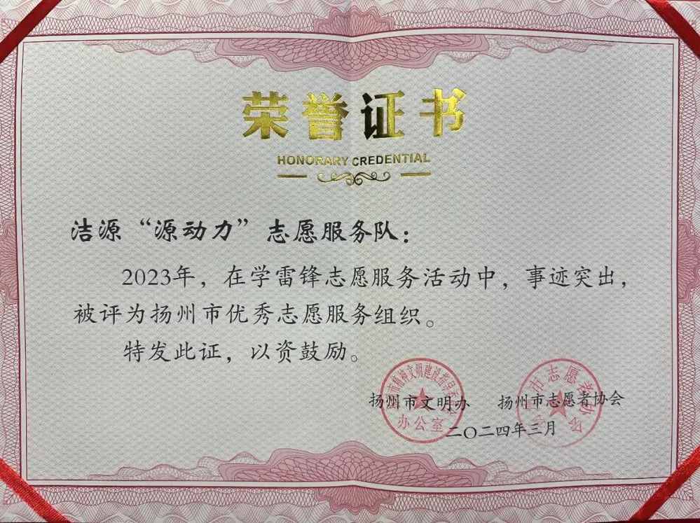 近日,由揚(yáng)州市文明辦、志愿者協(xié)會(huì)傳來喜訊,潔源環(huán)境公司“源動(dòng)力”志愿者服務(wù)隊(duì)榮獲“揚(yáng)州市優(yōu)秀志愿服務(wù)組織”稱號(hào)。