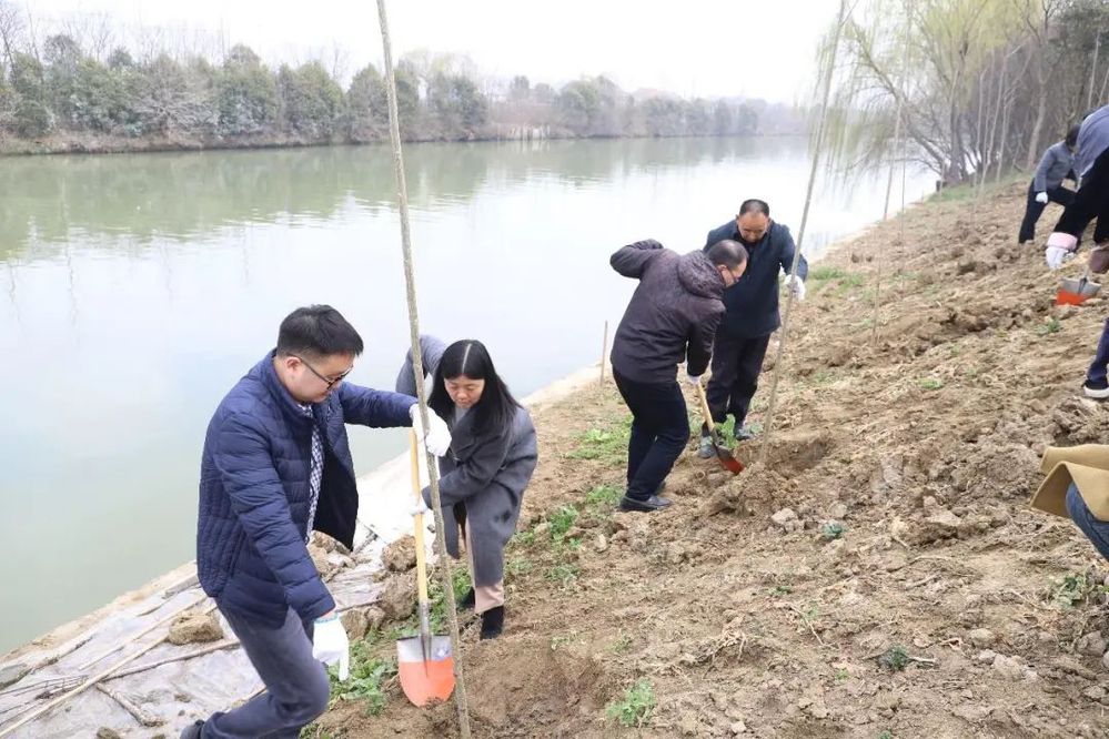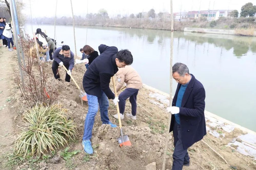 植樹現(xiàn)場,春光明媚,河堤上處處都是大家忙碌的身影,大家配合默契,揮鍬鏟土、扶苗培實,有條不紊地栽下一棵棵楊樹苗,為軍師村打造生態(tài)河道工程貢獻一份力量。
