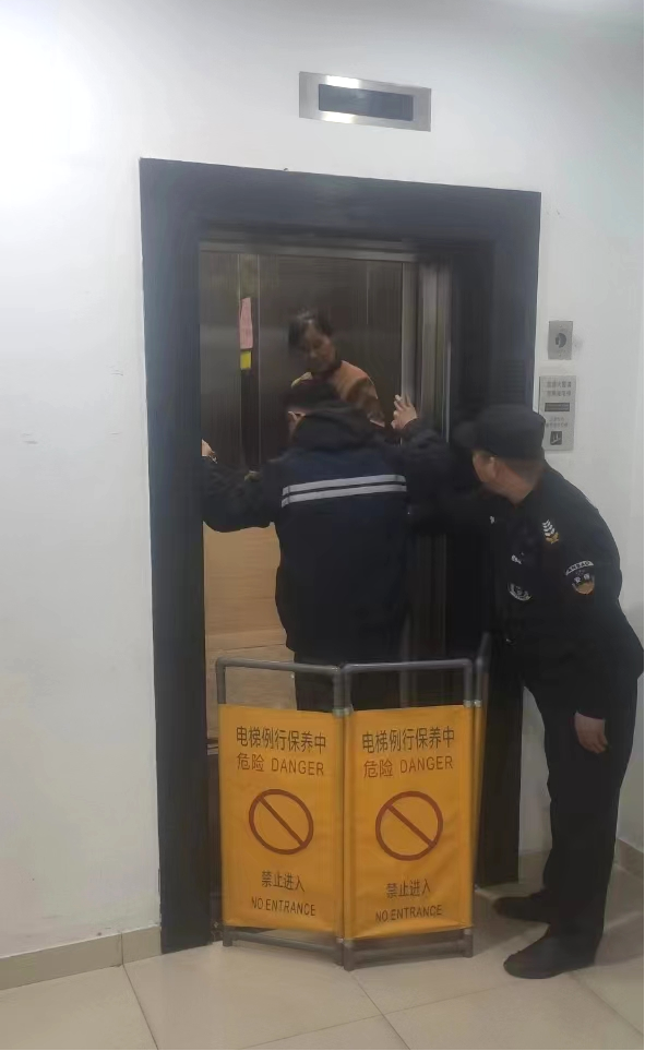 電梯維保技術(shù)人員到達現(xiàn)場后,先在被困電梯位置處安放警示標志,確認轎廂所在位置后,隨即展開施救;安全將“被困人員”救出后,電梯維保技術(shù)人員繼續(xù)排查電梯故障,恢復(fù)電梯正常運行。