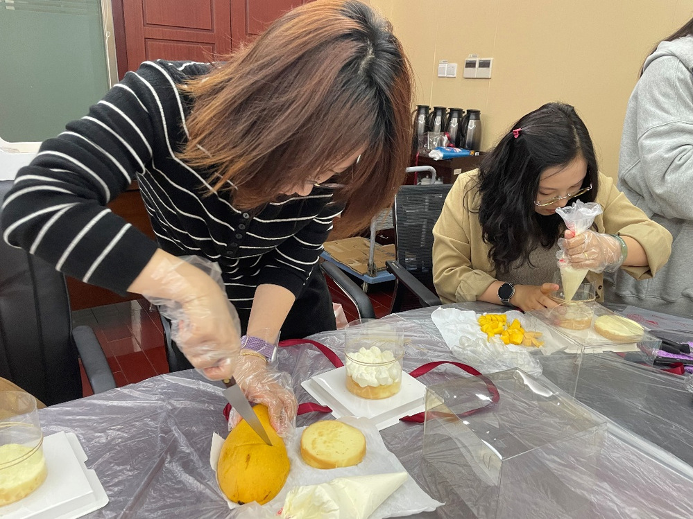 活動開始,大家將提前將準備好的蛋糕胚、奶油、水果等材料在桌面上鋪展開來。蛋糕烘焙老師現(xiàn)場詳細講解了蛋糕的制作方法,演示了制作過程,職工們用心聆聽、細心觀察后,精心制作出一個個讓人垂涎欲滴的蛋糕,現(xiàn)場滿屋飄香,連空氣都帶著一絲絲的甜蜜。