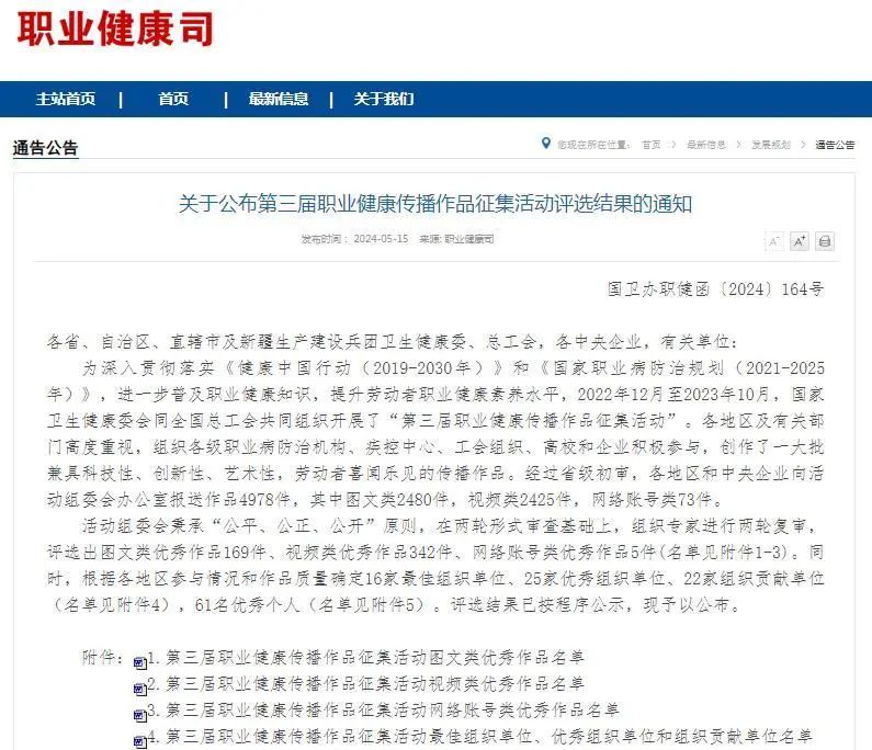 為深入貫徹落實(shí)《健康中國(guó)行動(dòng)(2019-2030年)》和《國(guó)家職業(yè)病防治規(guī)劃(2021-2025年)》,進(jìn)一步普及職業(yè)健康知識(shí),提升勞動(dòng)者職業(yè)健康素養(yǎng)水平,國(guó)家衛(wèi)生健康委、全國(guó)總工會(huì)共同組織開展了“第三屆職業(yè)健康傳播作品征集活動(dòng)”。我公司積極創(chuàng)作,踴躍參與征集活動(dòng),選送的《共享職業(yè)健康 共創(chuàng)健康水務(wù)》經(jīng)過初審、形式審查和專家評(píng)審等程序,入圍獲獎(jiǎng)名單。