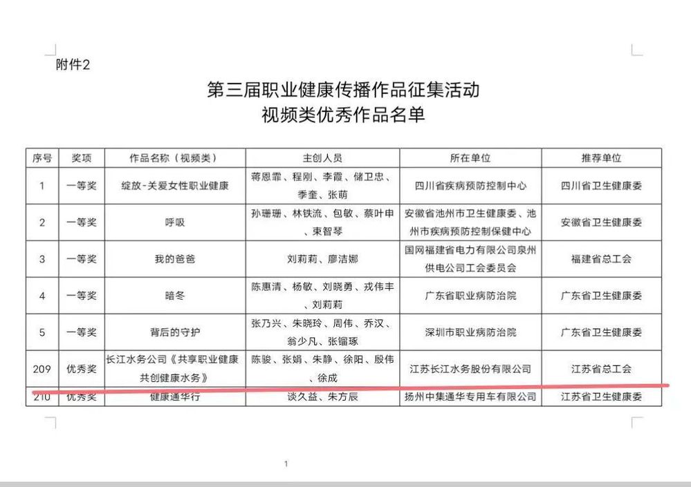 近日,國(guó)家衛(wèi)生健康委員會(huì)公布了“第三屆職業(yè)健康傳播作品征集活動(dòng)評(píng)選結(jié)果”,其中,江蘇長(zhǎng)江水務(wù)股份有限公司選送的《共享職業(yè)健康 共創(chuàng)健康水務(wù)》獲視頻類作品優(yōu)秀獎(jiǎng),為我省總工會(huì)推送的六件獲獎(jiǎng)作品之一,是我市總工會(huì)推送的唯一一件獲獎(jiǎng)作品。榮譽(yù)的取得,不僅是對(duì)公司在職業(yè)健康傳播方面所做工作的肯定,更是對(duì)公司深入淺出、富有創(chuàng)意的健康科普宣傳的認(rèn)可。