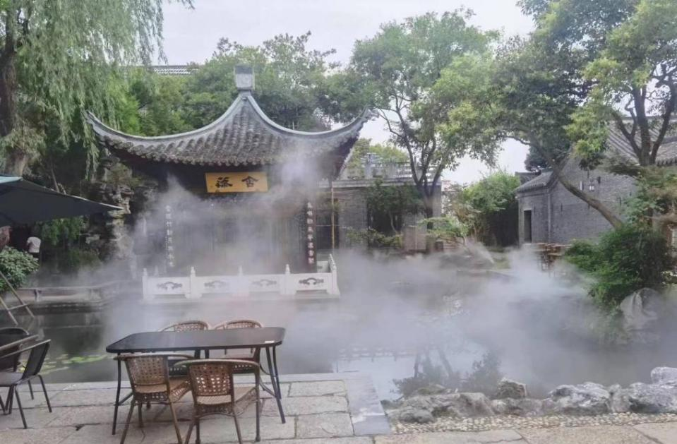 近日,由園林公司承接的長(zhǎng)樂(lè)客棧含藻亭霧森系統(tǒng)打造項(xiàng)目施工完畢、正式投用。霧森系統(tǒng)的啟用,豐富了含藻亭周圍假山綠植的景觀層次,使游客漫步其中,宛置仙境。
