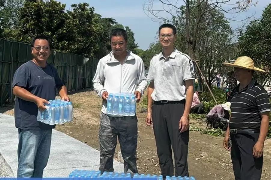 在京杭融園、九境融園、銀墅灣綠化養(yǎng)護(hù)項(xiàng)目、15米風(fēng)光帶景觀綠化項(xiàng)目等多個(gè)施工現(xiàn)場(chǎng),城建園林經(jīng)理曾天斌帶領(lǐng)職工們共同為一線工人們送上數(shù)箱飲用水,叮囑大家注意防暑,保障自身的安全健康?!胺浅8兄x公司的關(guān)心,我們一定會(huì)堅(jiān)守崗位、努力工作,同時(shí)也會(huì)注意高溫避暑休息,錯(cuò)峰養(yǎng)護(hù)”領(lǐng)到防暑降溫物資后,綠化養(yǎng)護(hù)工王師傅笑著說道。