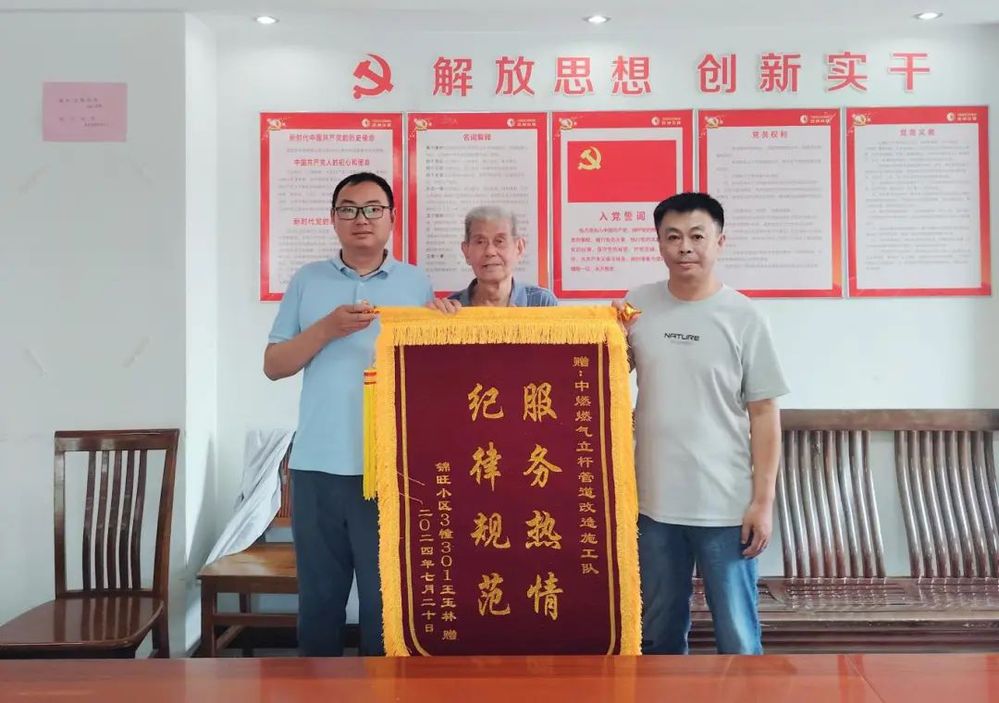 2024年7月26日,一個平凡的星期五,對于揚州中燃客服部來說,卻是一個充滿溫暖和感動的日子。來自錦旺社區(qū)居民代表王玉林老先生冒著酷暑送來了一面錦旗,上面繡著“服務熱情,紀律規(guī)范”幾個大字,這面錦旗是對揚州中燃燃氣立管改造工作的認可。