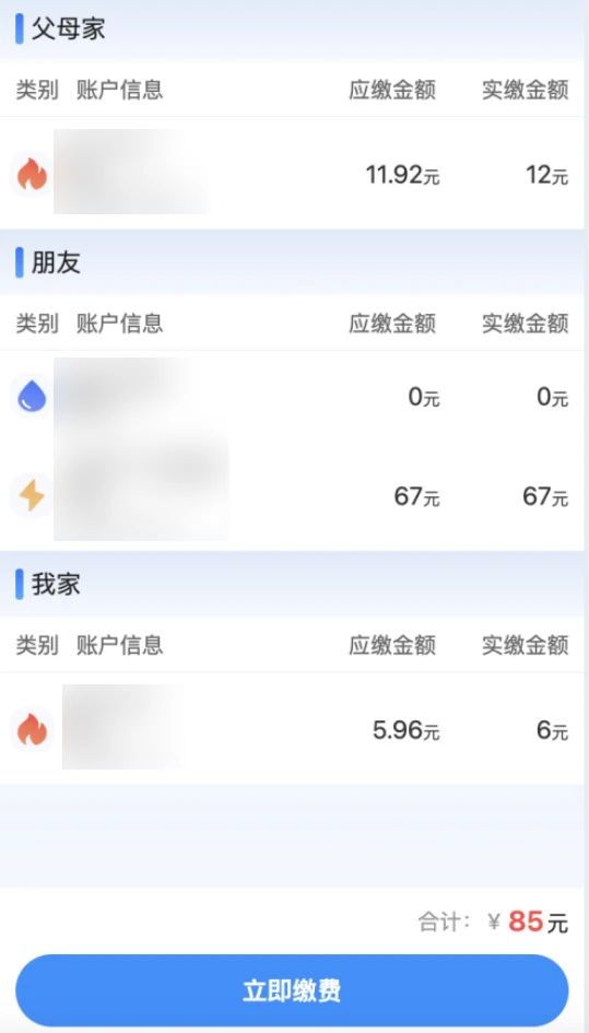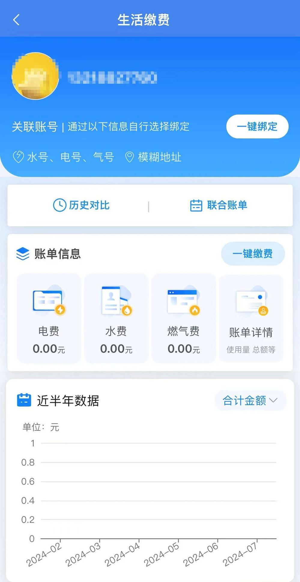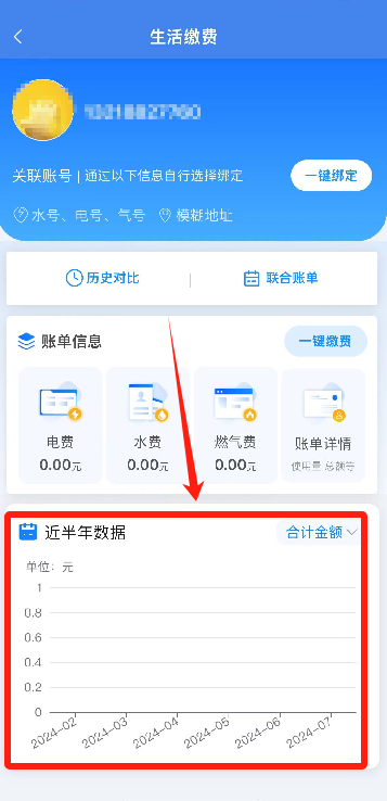 新增繳費(fèi)戶號后,您可點(diǎn)擊生活繳費(fèi)右上角一鍵繳費(fèi)按鈕,此時頁面會顯示當(dāng)前登錄用戶綁定的所有繳費(fèi)戶號。(可綁定不會使用智能機(jī)的父母家水電氣戶號哦~)