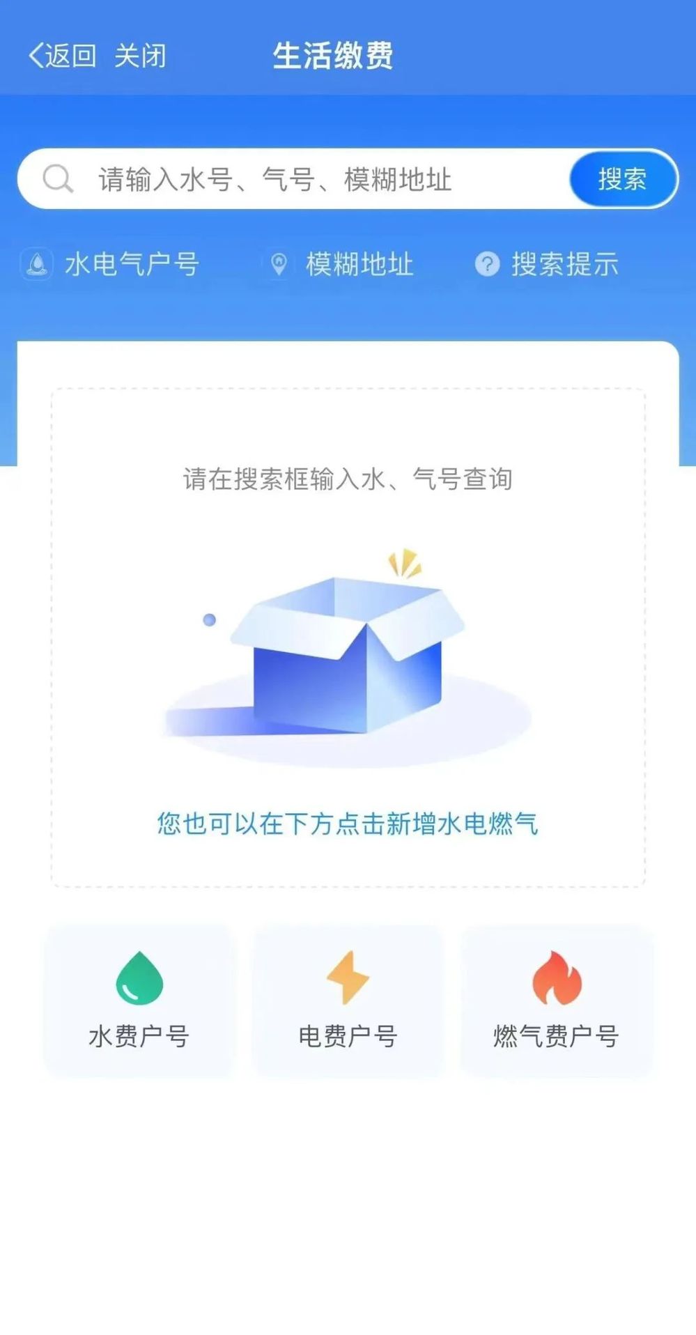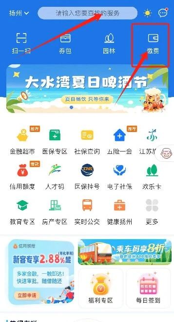 打開我的揚(yáng)州APP,點(diǎn)擊右上角繳費(fèi)按鈕或在頂部搜索欄搜索“生活繳費(fèi)”,進(jìn)入生活繳費(fèi)頁面。