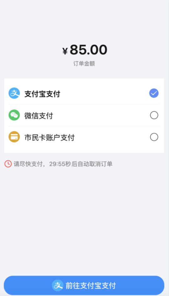 點(diǎn)擊立即繳費(fèi)按鈕,進(jìn)入繳費(fèi)頁面,您可以選擇支付寶/微信/市民卡賬戶進(jìn)行合并支付或分別支付繳費(fèi)哦。