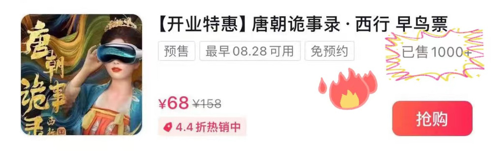 8月19日,備受矚目的《唐朝詭事錄·西行》國(guó)潮沉浸VR劇場(chǎng)揚(yáng)州店在大眾點(diǎn)評(píng)和抖音平臺(tái)同步開放早鳥票購(gòu)買,上線僅24小時(shí),銷量便破一千五,掀起了一股購(gòu)票熱潮。