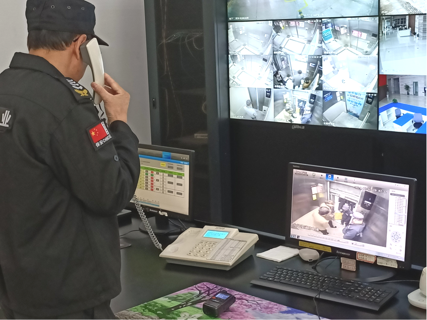 演練開始,乘坐人員進(jìn)入電梯轎廂,由于突發(fā)情況造成電梯困人事故。監(jiān)控室接到求救電話,在確定被困人員的被困位置、被困人數(shù)、人員情況等,立即啟動緊急救援程序。