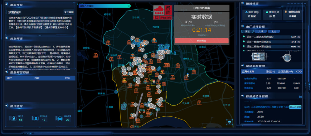 6月6日開始,各相關(guān)部門已根據(jù)天氣預(yù)警按照統(tǒng)一部署和既定安排開展污水設(shè)施加密巡查,部署好應(yīng)急人員、物資隨時待命。6月7日凌晨3時23分氣象部門發(fā)布暴雨藍色預(yù)警后,公司立即通過“城排通”系統(tǒng)啟動應(yīng)急預(yù)案,快速落實污水設(shè)施、雨水排口、易積水點和在建工程現(xiàn)場的巡查和應(yīng)急處置工作。由于突降暴雨,市區(qū)部分道路很快出現(xiàn)積水,且涉及多個高考考點周邊,情況十分緊急,與此同時氣象部門緊急升級發(fā)布暴雨黃色預(yù)警。為及時做好處置,公司第一時間調(diào)整了應(yīng)急響應(yīng)等級,通過“城排通”系統(tǒng)實時監(jiān)測運行數(shù)據(jù),加強信息共享和部門間應(yīng)急聯(lián)動,適時調(diào)整運行調(diào)控策略,對發(fā)現(xiàn)的路面積水險情,迅速指揮、調(diào)度搶險班組和物資開展應(yīng)急排澇。