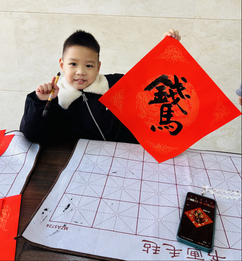 “媽媽,你看我寫的‘馬上有錢’!”“爸爸,我要把這個‘馬上有?!N在我家房門上?!彪m然筆觸稚嫩,卻飽含童真與心意,不少孩子還發(fā)揮創(chuàng)意,在福字旁添畫馬蹄、祥云、煙花等圖案,讓作品更顯生動活潑?,F(xiàn)場歡聲笑語不斷,家長們或在旁協(xié)助,或用手機記錄溫馨瞬間、與孩子合影留念,處處暖意融融、年味十足。